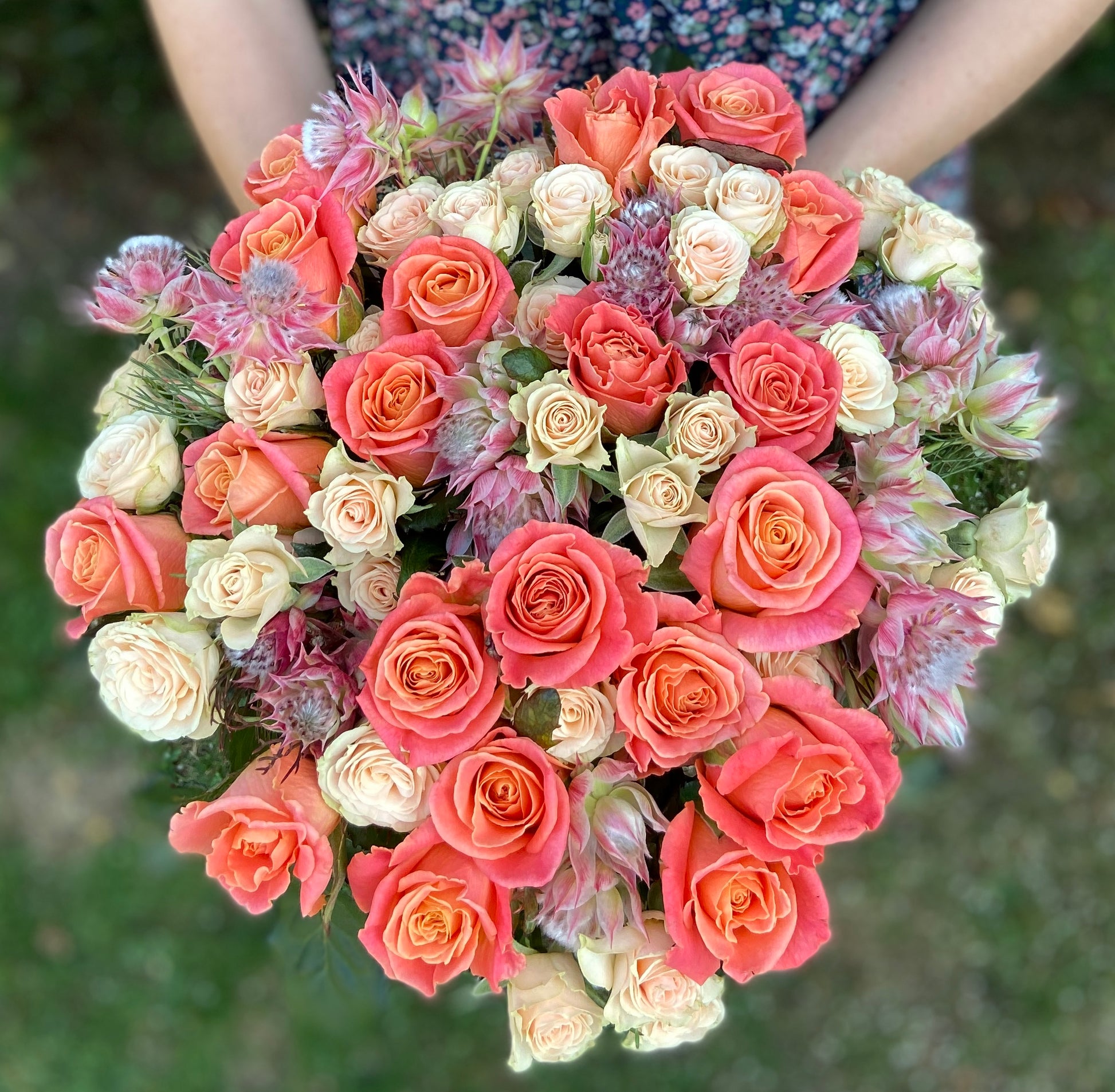 Say it with roses! This cheerful bouquet combines soft pink roses with vibrant coral blooms for a hand-tied arrangement full of colour, charm, and personality. Perfect for weddings, anniversaries, gifts, or just because, it adds a pop of joy and elegance to any occasion.