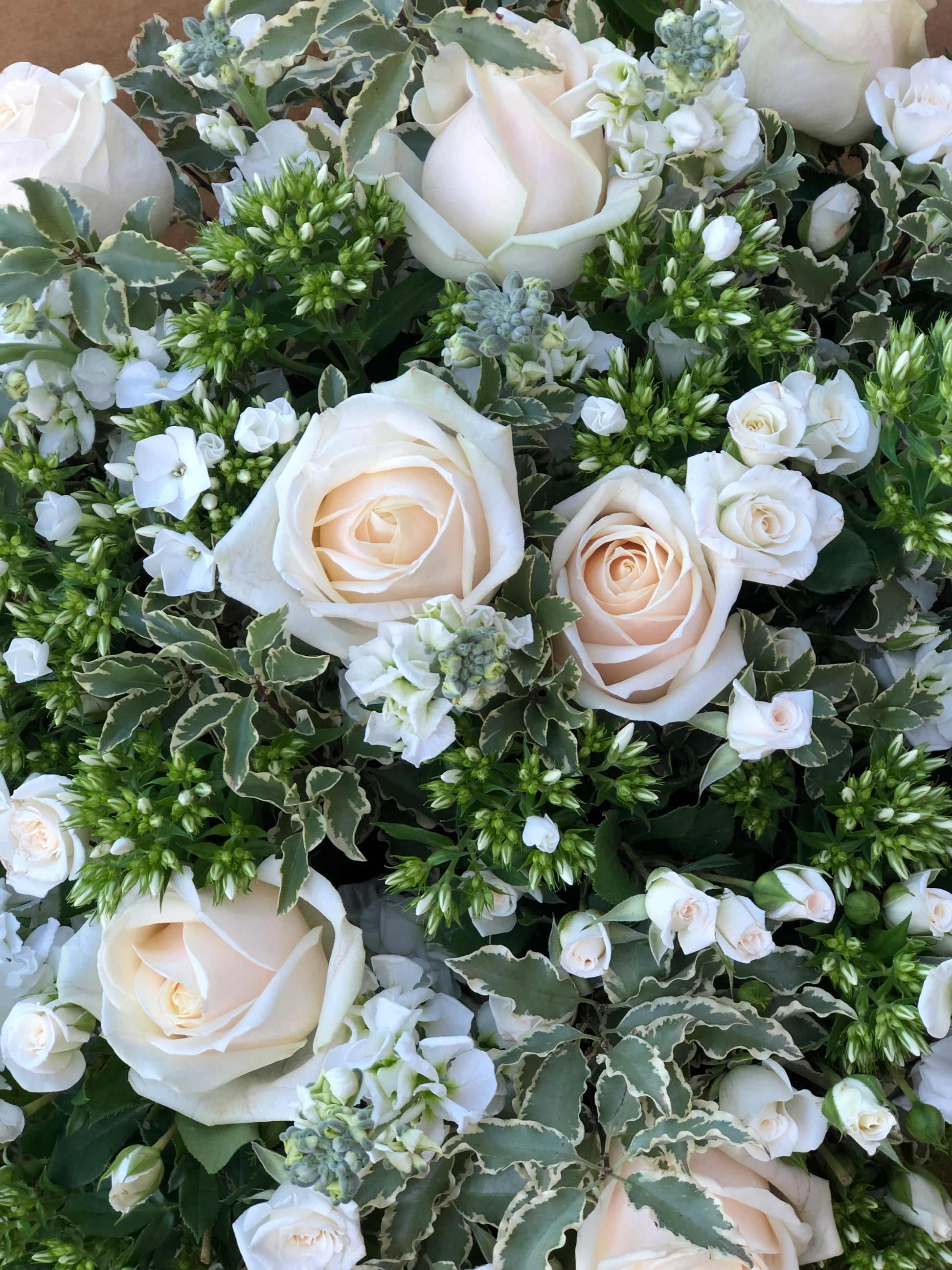 Fresh, elegant, and effortlessly chic — this hand-tied bouquet pairs classic white roses with lush green foliage for a natural, timeless look. Perfect for weddings, anniversaries, gifts, or just because, it brings calm, romance, and understated beauty to any occasion.